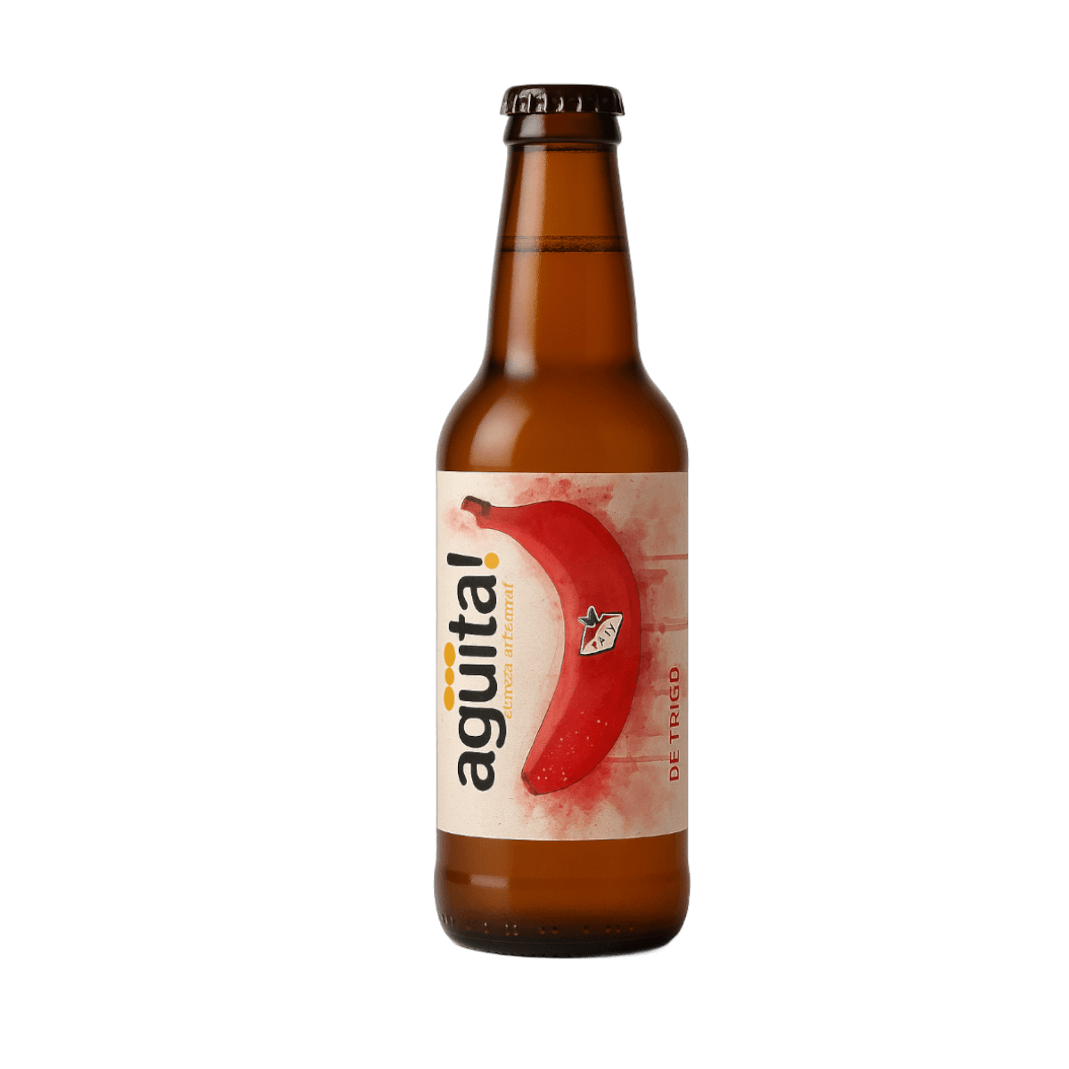 Agüita Trigo y Plátano Rojo es una cerveza artesanal con plátano de Canarias, estilo Witbier belga, elaborada con trigo y plátano rojo local. Refrescante, ligeramente ácida y con espuma cremosa, combina dulzor frutal, cuerpo suave y un final cítrico chispeante.